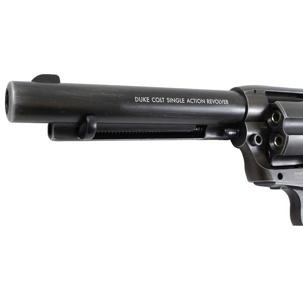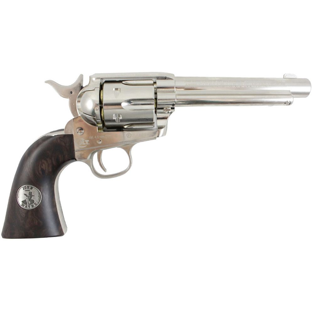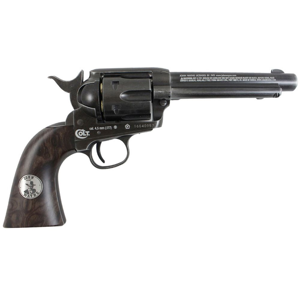 Comments: The Duke would be proud to have his name on this single action BB revolver. High quality machined with a full metal frame and imitation wood grip, this 4.5mm caliber six shooter looks, feels, and shoots just like a real steel Colt .45. It features an authentic rotating cylinder with a working ejector rod, brass cartridges, and a single action trigger system. The frame is engraved with authentic Colt trademarks, patent dates, and special markings unique to the John Wayne signature series. This steel BB model has extra fire power, unleashing rounds at over 400 FPS.
