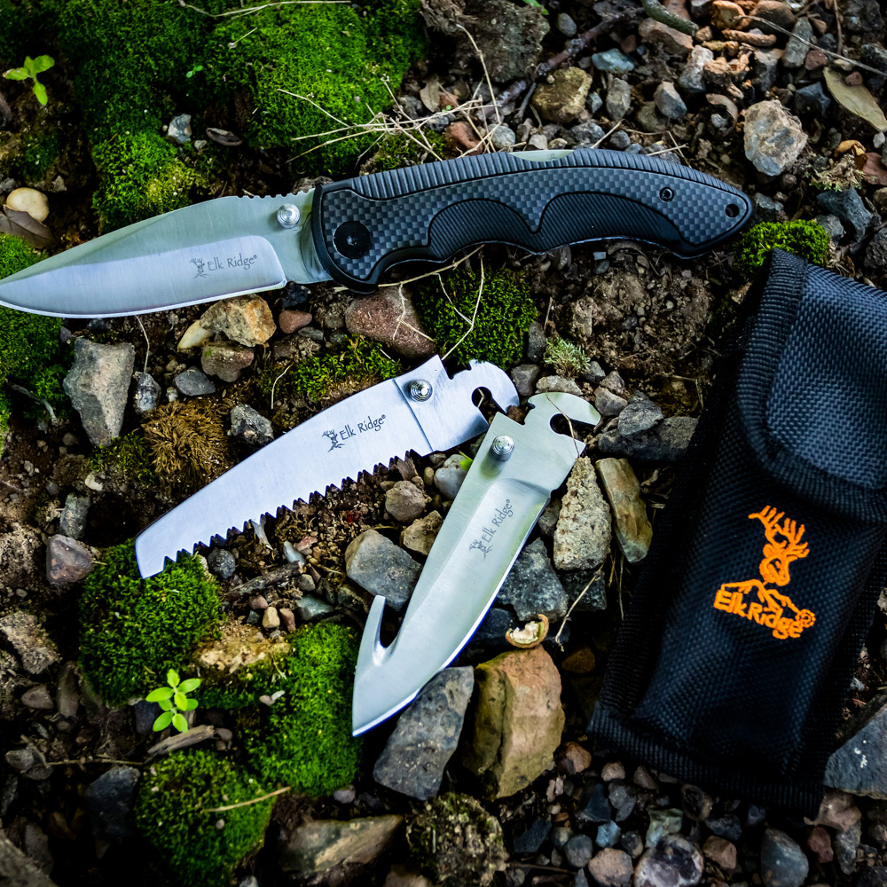 Introducing the Elk Ridge Xchange Folding Knife, a versatile tool designed for the outdoorsman. This knife features an overall length of 8.35 inches, with a 3.6-inch blade made of 3Cr13 steel. The interchangeable blade system allows for easy swapping between the standard blade, a saw blade, and a guthook blade, making it suitable for various tasks.