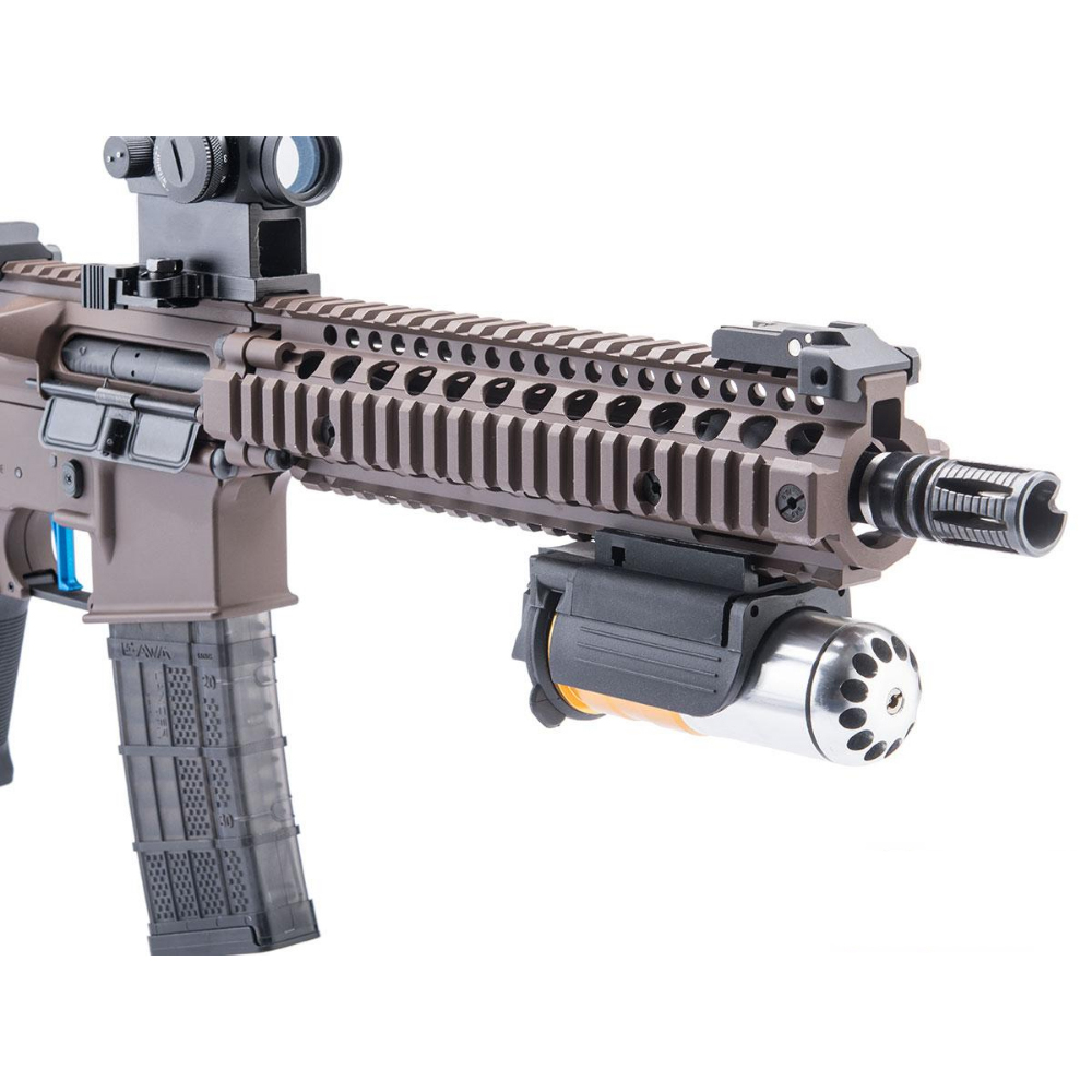 The 6mmProShop Airsoft Pocket Cannon is compact for easy transportation, lightweight, robust construction, and compatible with all standard 40mm Airsoft M203 gas grenades shells capable of launching bb shower, foam projectiles, and other interesting shells made for the standard Airsoft 40mm gas grenade launcher system. Externally, the Pocket Cannon is equipped with the advanced ergonomic Matrix tactical training motor grip that fits most Airsoft M4 AEG platforms, and thus, the Pocket cannon can take on a huge selection of grips if you want to give it a different look! The Pocket cannon is equipped with an on-frame safety, a railed frame for scopes and optics, and a thumb-activated switch for the spring latched outer barrel enabling high-speed shell loading and reloading. It is a great backup weapon with the highest potential of fire-power vs. time vs. load whether you are in a CQB environment or as a sniper! War stories are created each time you pocket cannon a friend or a foe! Let your legend be told!